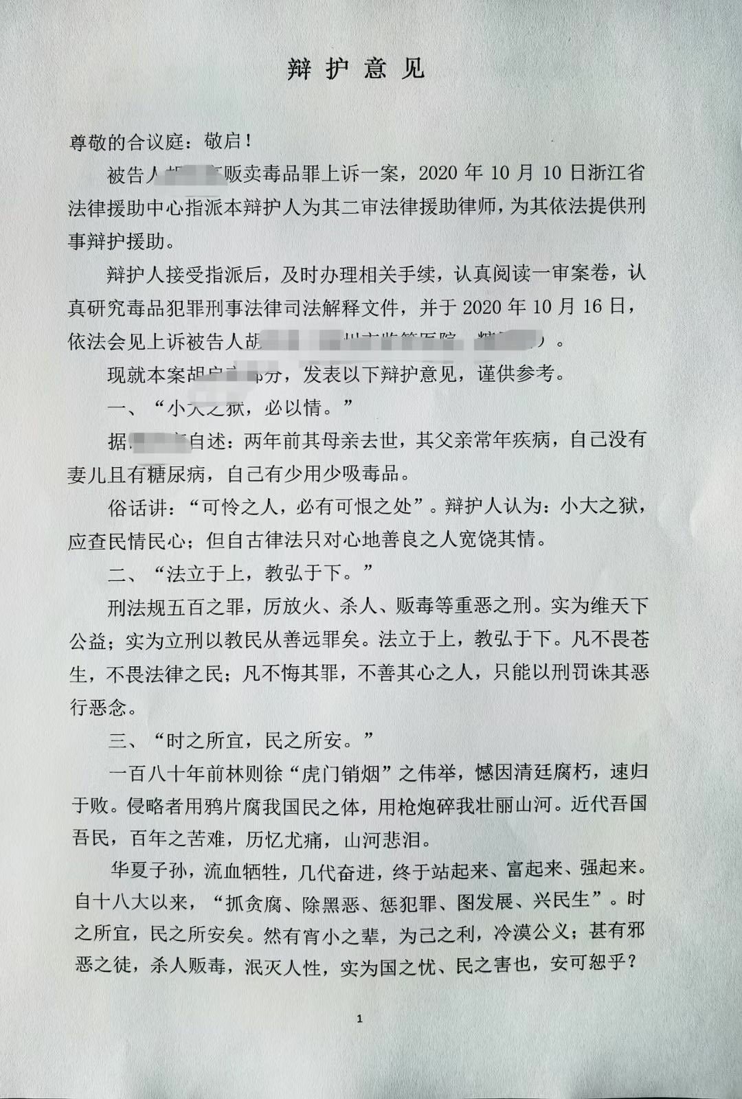 这份《辩护意见》是用古文写作而成,文本的抬头为“尊敬的合议庭:敬启”,落款为:“此致浙江省高级人民法院”,文末还有辩护律师林维清的署名及其印章。《辩护意见》文中显示,林维清是被告人胡某某贩卖毒品罪上诉一案的辩护律师。