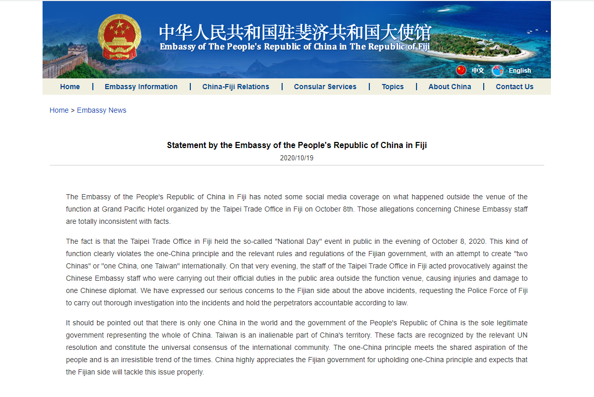 新京报快讯 据中国驻斐济大使馆消息,中国驻斐济大使馆19日发布声明称,注意到了一些社交媒体报道了10月8日台北驻斐济贸易办事处在大太平洋酒店举办的活动会场外发生的事情。其中有关中国使馆工作人员的说法与事实完全不符。声明指出,台方工作人员对在活动场地外公共区域执行公务的中国驻斐济使馆工作人员进行挑衅,造成1名中国外交官受伤。