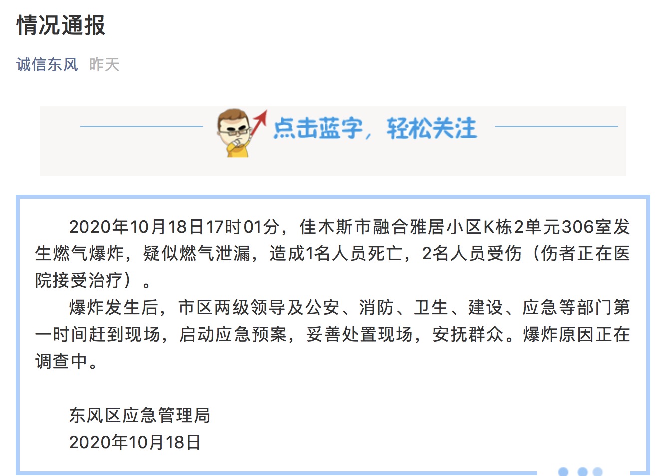 18日20时许,东风区应急管理局发布通告:10月18日17时01分,佳木斯市融合雅居小区K栋2单元306室发生燃气爆炸,疑似燃气泄漏,造成1名人员死亡,2名人员受伤。伤者已被送往医院接受治疗,爆炸原因仍在调查中。