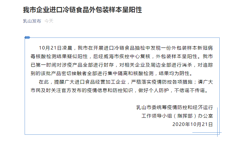 山东乳山一企业进口冷链食品外包装样本呈阳性