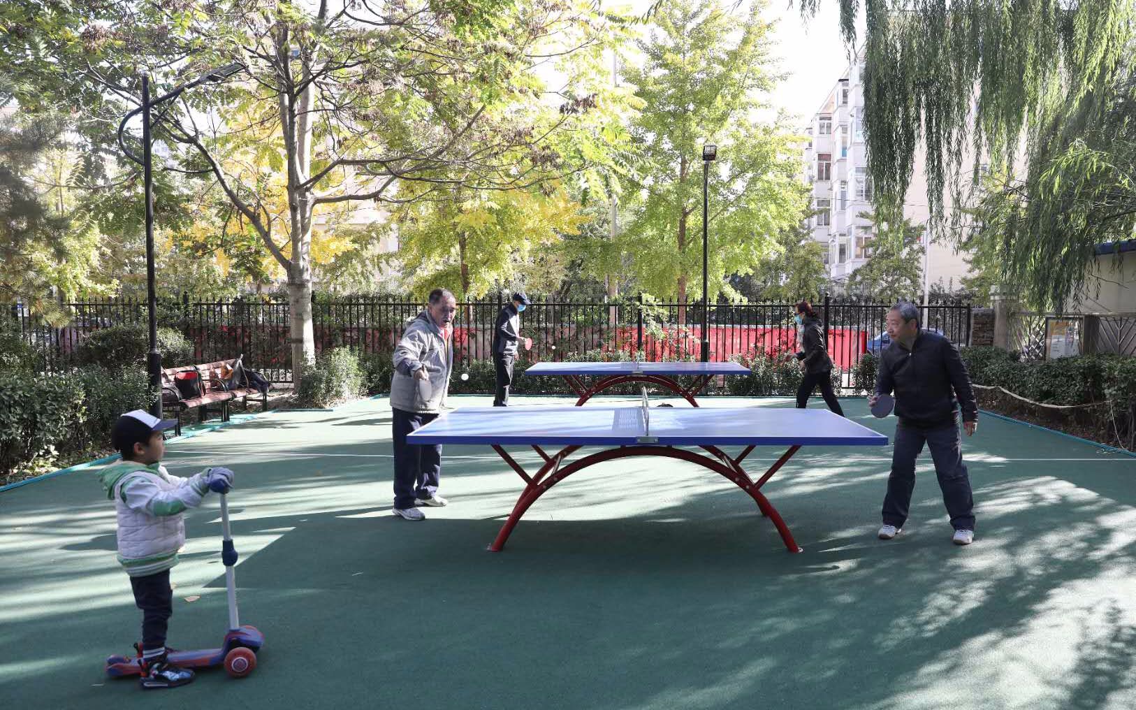 朝阳区奥运村街道科学园南里六区,小区改造后,居民在体育运动休闲区域打乒乓球。摄影/新京报记者 王飞