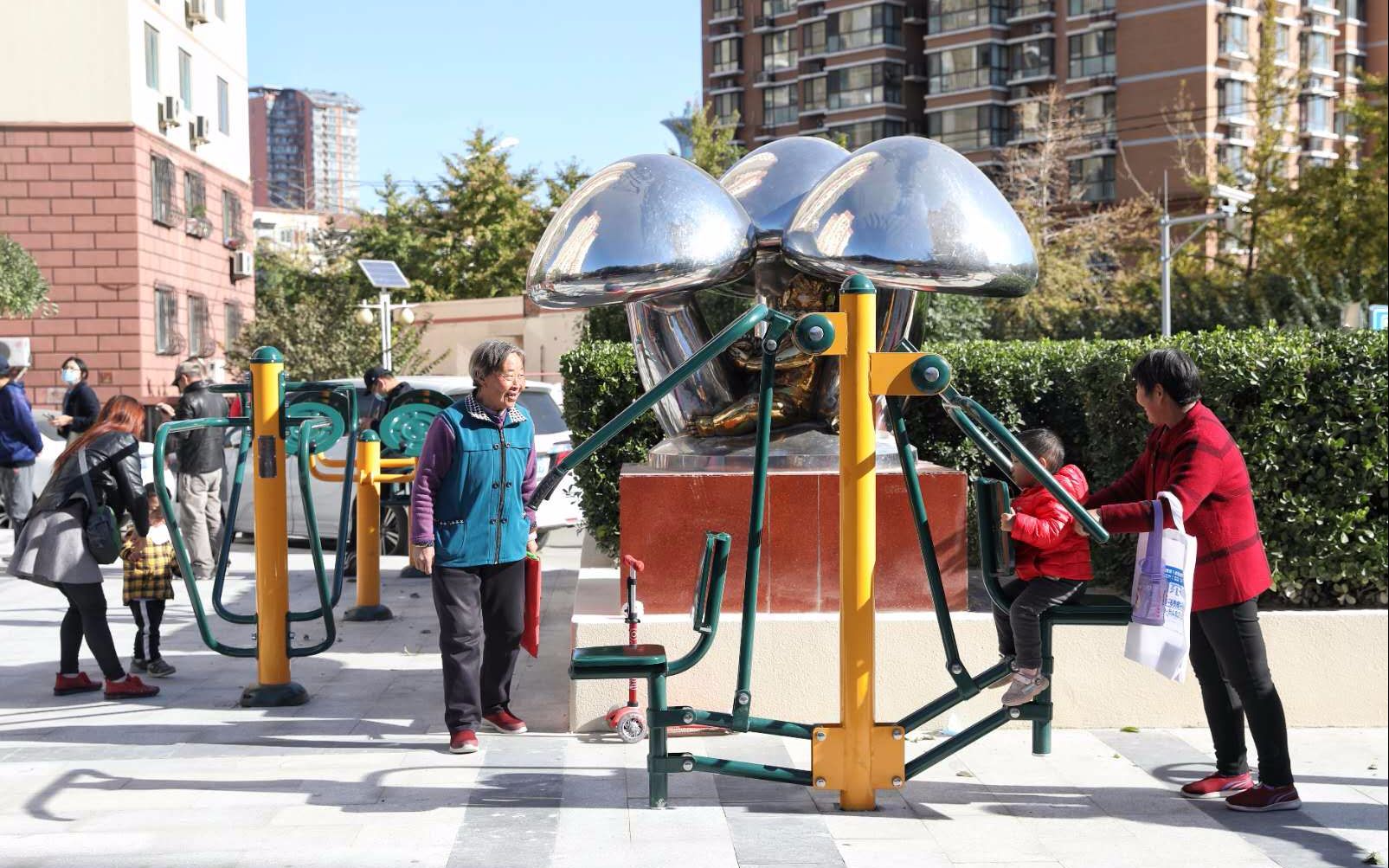 朝阳区奥运村街道科学园南里六区,改造后中心广场设立了健身器材,吸引不少居民前来锻炼。摄影/新京报记者 王飞