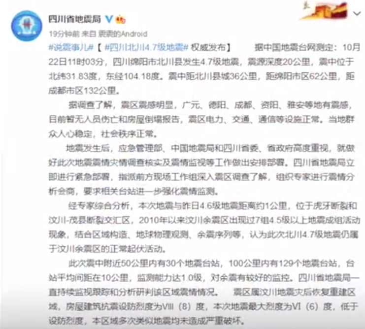 新京报讯(记者 靳晴 朱必胜)10月22日,据中国地震台网消息,四川绵阳市北川县发生4.7级地震,四川多地市民反映震感强烈。21日中午,北川县发生4.6级地震。四川省地震局消息称,经专家综合分析,两次地震距离约1公里,均属于汶川余震区的正常起伏活动。