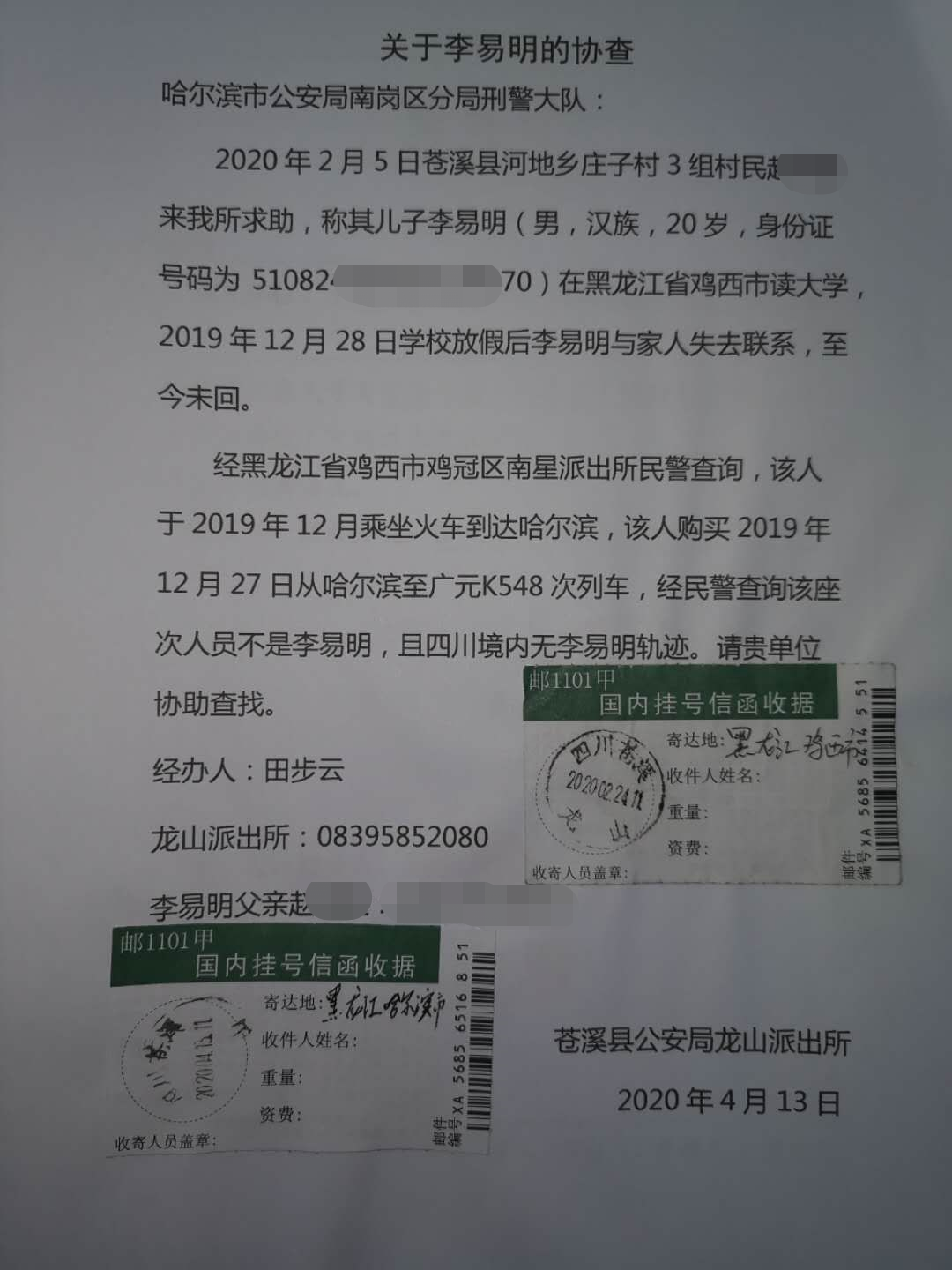 广元市苍溪县龙山派出所民警调查发现,李易明到达哈尔滨后,曾购买从哈尔滨东站开往广元的火车。今年4月,由龙山派出所发给哈尔滨警方的协查函中显示,“经民警查询,座次人员不是李易明,且四川境内无李易明轨迹”。