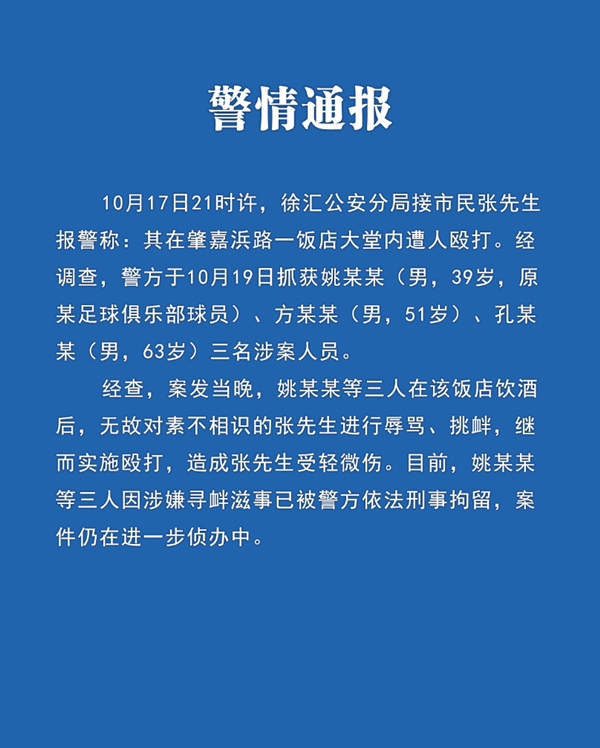 10月22日中午,上海市公安局发布通报称,10月17日晚,姚某某(男,39岁,原某足球俱乐部球员)、方某某、孔某某在肇家浜路一饭店饮酒后,无故对素不相识的张先生进行辱骂挑衅,继而实施殴打,造成其受轻微伤。10月19日,警方将三人抓获。目前,姚某某等三人因涉嫌寻衅滋事已被警方依法刑事拘留,案件仍在进一步侦办中。