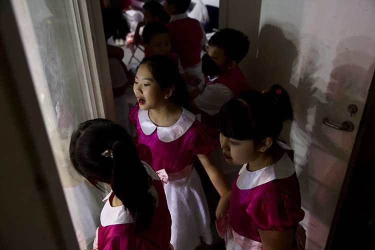 等待登场的合唱团小演员在后台观看演出。