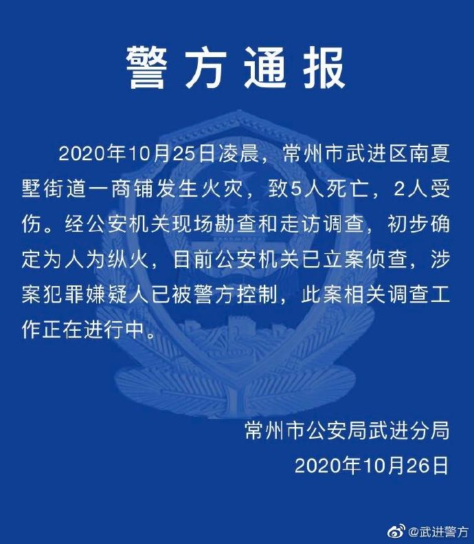 新京报快讯 据江苏常州市公安局武进分局官方微博消息,10月25日凌晨,常州市武进区南夏墅街道一商铺发生火灾,致5人死亡,2人受伤。经公安机关现场勘查和走访调查,初步确定为人为纵火,目前公安机关已立案侦查,涉案犯罪嫌疑人已被警方控制,此案相关调查工作正在进行中。