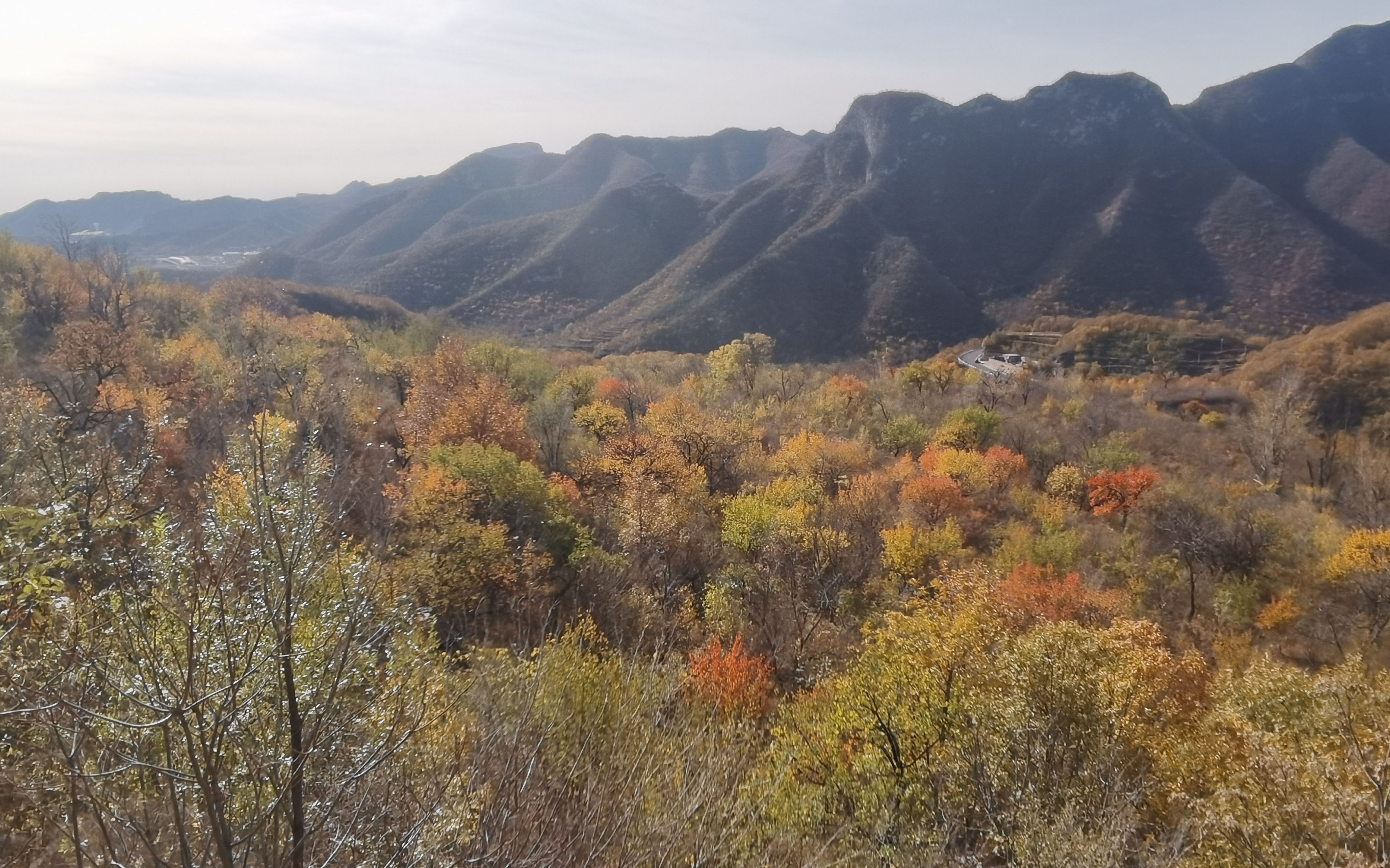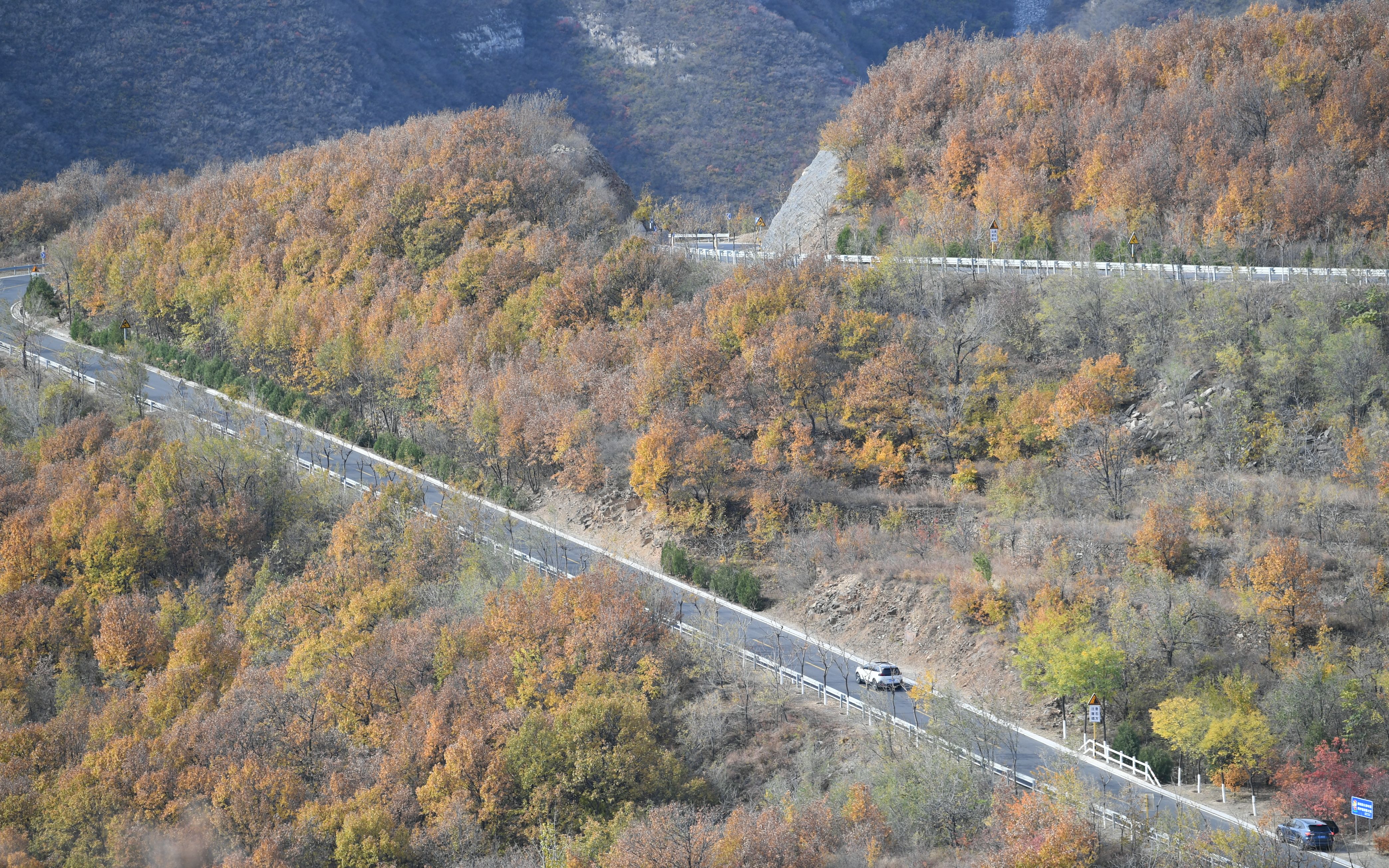 10月27日,记者在京西潭王路上看到,这里的群山已被彩色的树叶覆盖,沿途的盘山公路两侧,红色、黄色、橙色等各种颜色的树木,经霜更艳,将千年古道掩映其中。