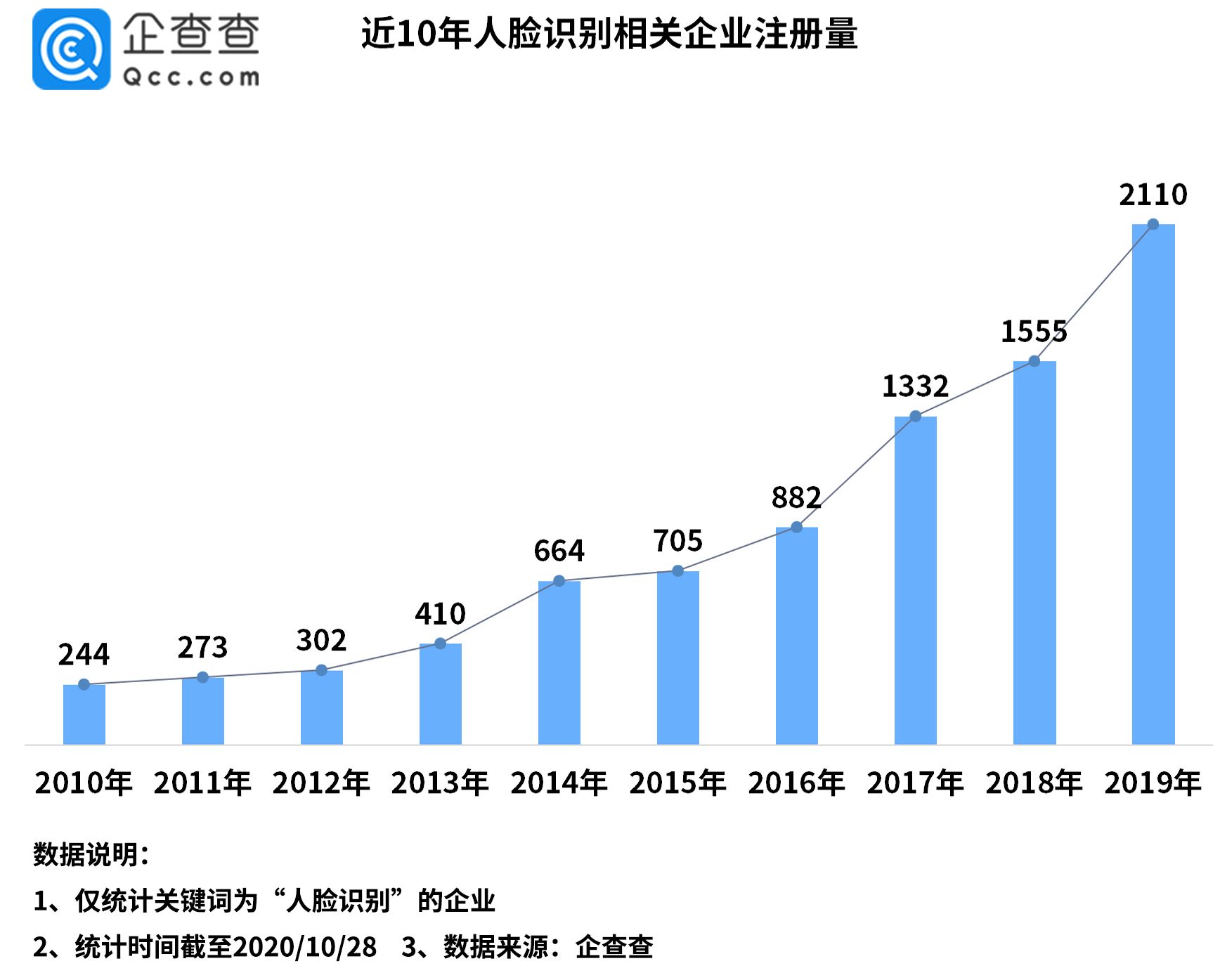 随着科学技术的发展,人工智能(AI)领域的研发和推广逐渐被上升至国家级战略规划,我国人工智能政策的支持,为人脸识别的发展提供了坚实保障。企查查数据显示,2017年在《新一代人工智能发展规划》的政策推动下,当年人脸识别相关企业新增注册量突破千家,同比增长51%。2019年相关企业注册量达2110家,同比增长36%,是10年注册量的9倍。