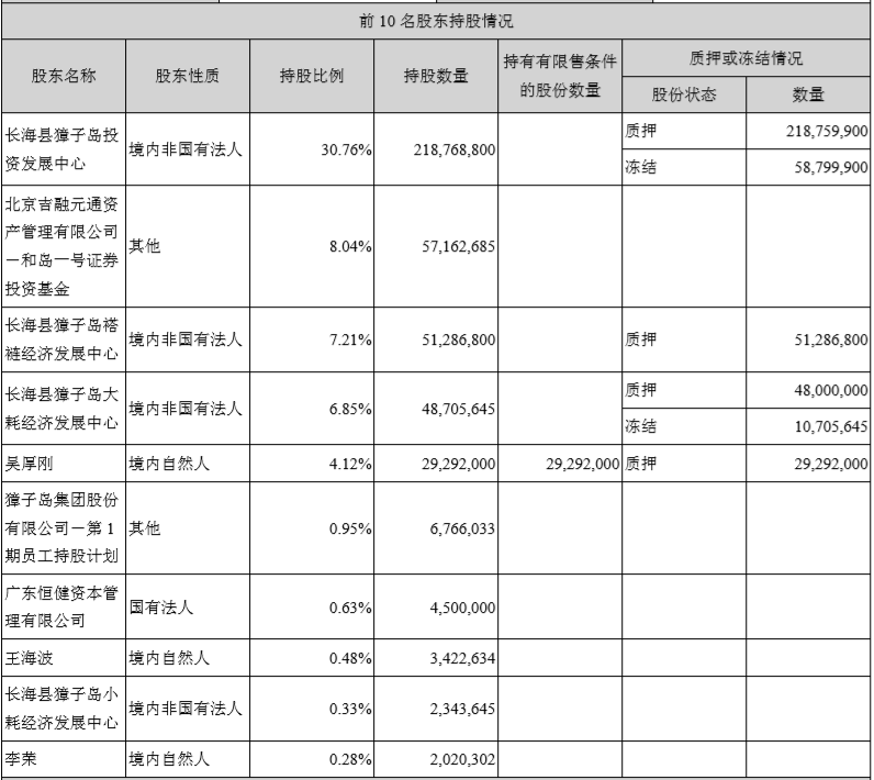 资料显示,长海县投资背后实控方为长岛县獐子岛镇人民政府,三季报显示,其目前共有约2.1876亿股处于质押状态,约占其持股数的99.9954%,此外,长海县投资还有5879.99万股处于冻结状态。