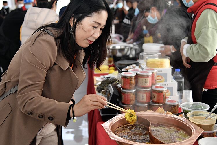 秋冬季节吃菊花具有良好的保健功效,鲜食、干食、熟食、焖、蒸、煮、炒、拌、炸皆宜。菊花不仅可以切丝入馅制成饺子、点心等,还可以深加工做菊花茶、菊花酒,提取菊花黄酮做保健品和药品。图为:游客品尝菊花涮肉。