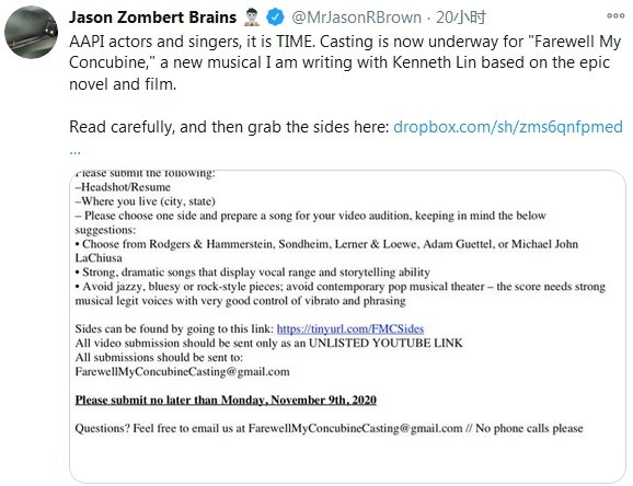 新京报讯 11月1日,百老汇知名音乐剧制作人简森·罗伯特·布朗(Jason Robert Brown)透露将推出《霸王别姬》的音乐剧,已开始公开选角。