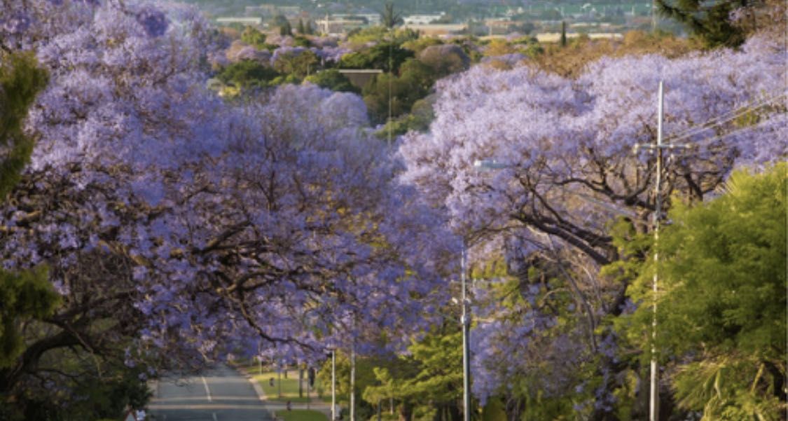 每年的9月至11月,比勒陀利亚7万多株蓝花楹绽放,远远望去,仿佛蓝紫色的云雾萦绕整座城市。因此,这里有了“蓝花楹之城”的美誉。1888年,蓝花楹漂洋过海从美洲来到非洲大陆,南非诗人JD Celliers带来两棵树苗,种在比勒陀利亚的一条道路上,为纪念诗人,这条路被命名为Celliers街。最早的两棵树现在位于Sunnyside小学内,一块纪念牌匾立在树旁,象征着蓝花楹在南非的渊源。