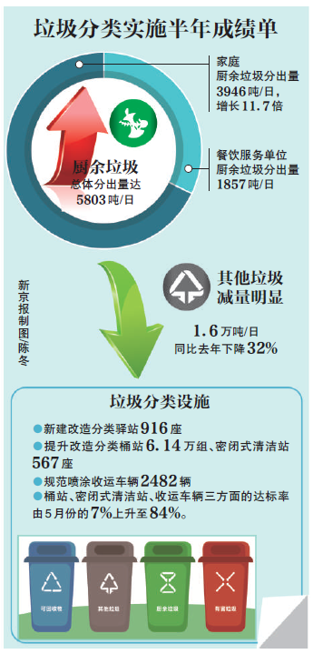 北京市城管委副主任李如刚介绍,自5月1日新条例正式实施以来,北京市家庭厨余垃圾分出量大幅提升,十月份分出量从条例实施前的309吨/日增长至3946吨/日,增长了11.7倍,厨余垃圾分出率达到19.79%。加上餐饮服务单位厨余垃圾1857吨/日,厨余垃圾总体分出量达5803吨/日。