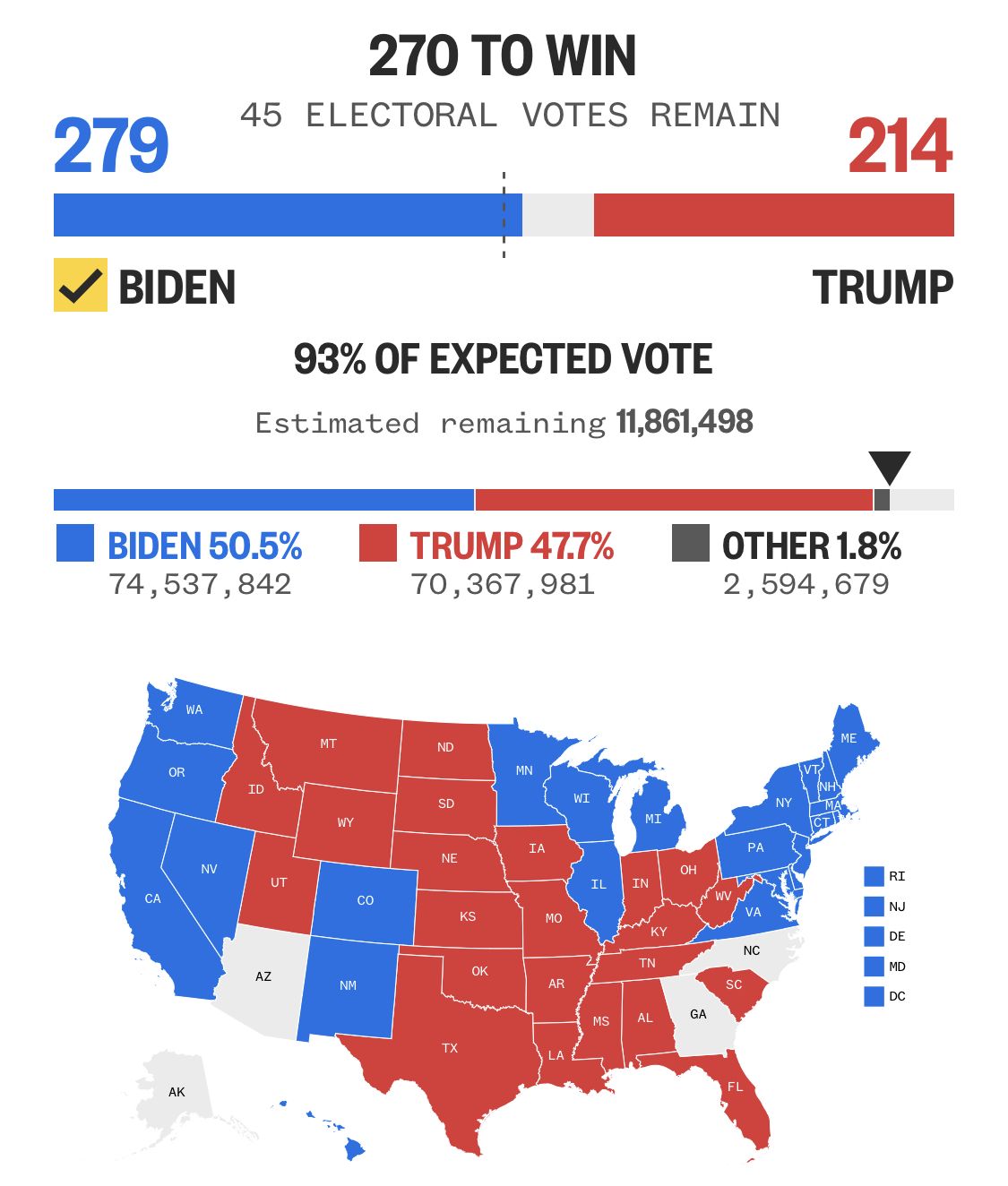 根据NBC数据,拜登赢得宾夕法尼亚州的20张选举人票和内华达州的6张选举人票,加上此前的253张,总共获得279张选举人票,超过胜选所需的270张选举人票。福克斯新闻此前已宣布亚利桑那州也归给拜登,因此拜登赢得290张选举人票。