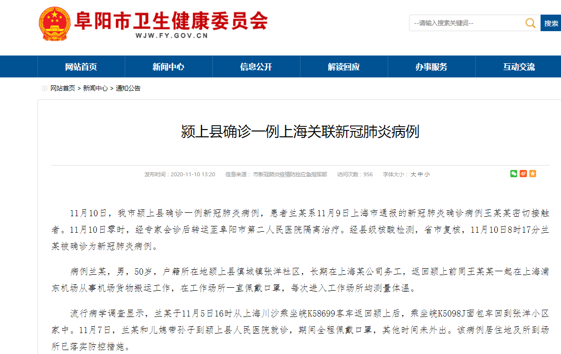 安徽阜阳颍上县确诊一例上海关联新冠肺炎病例