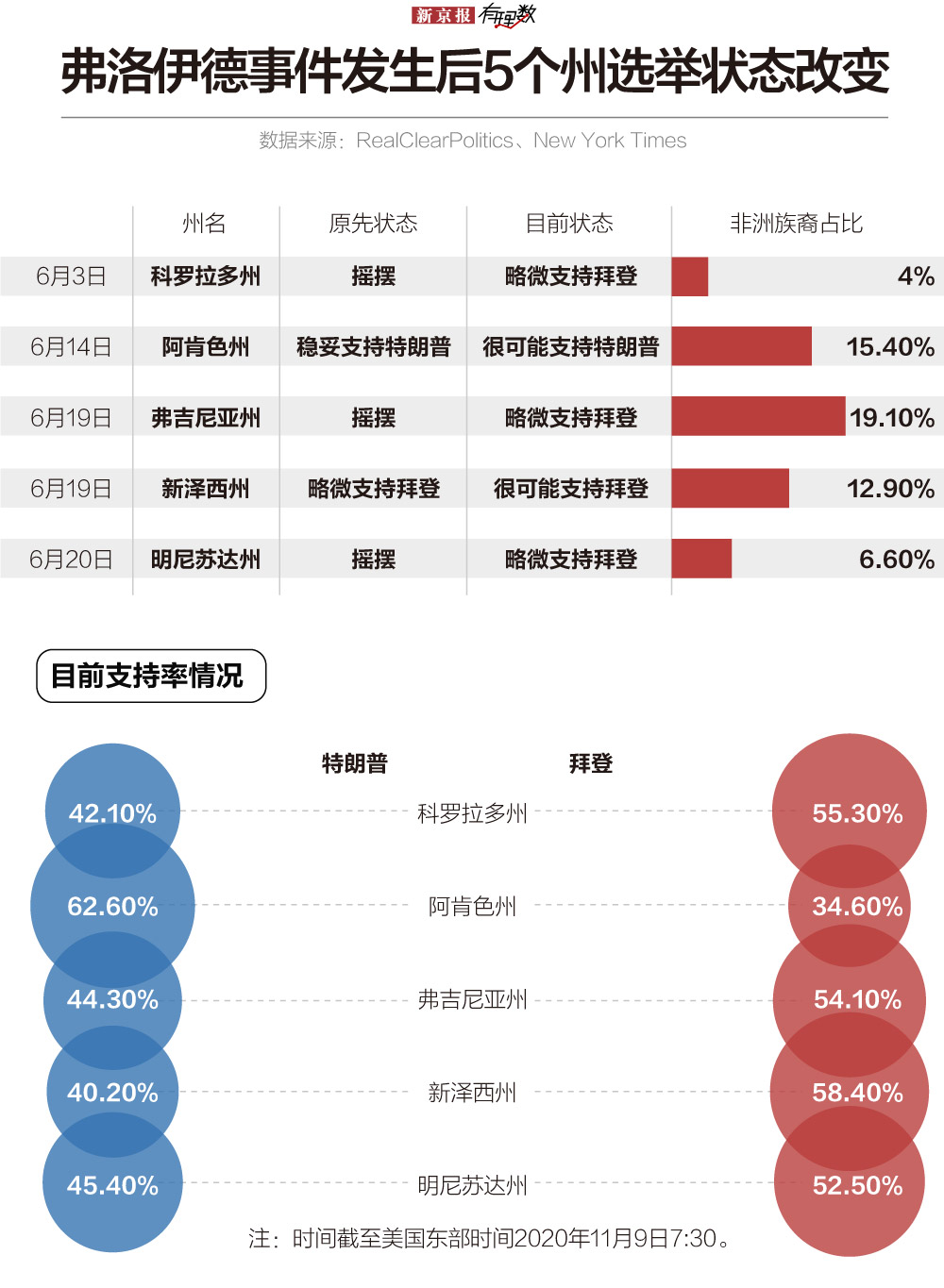 在弗洛伊德事件发生不久,包括事件发生地的明尼苏达州在内的5个摇摆州民调数据都发生了变化。据RealClearPolitics数据统计,5个摇摆州关于特朗普的支持率都下降了。