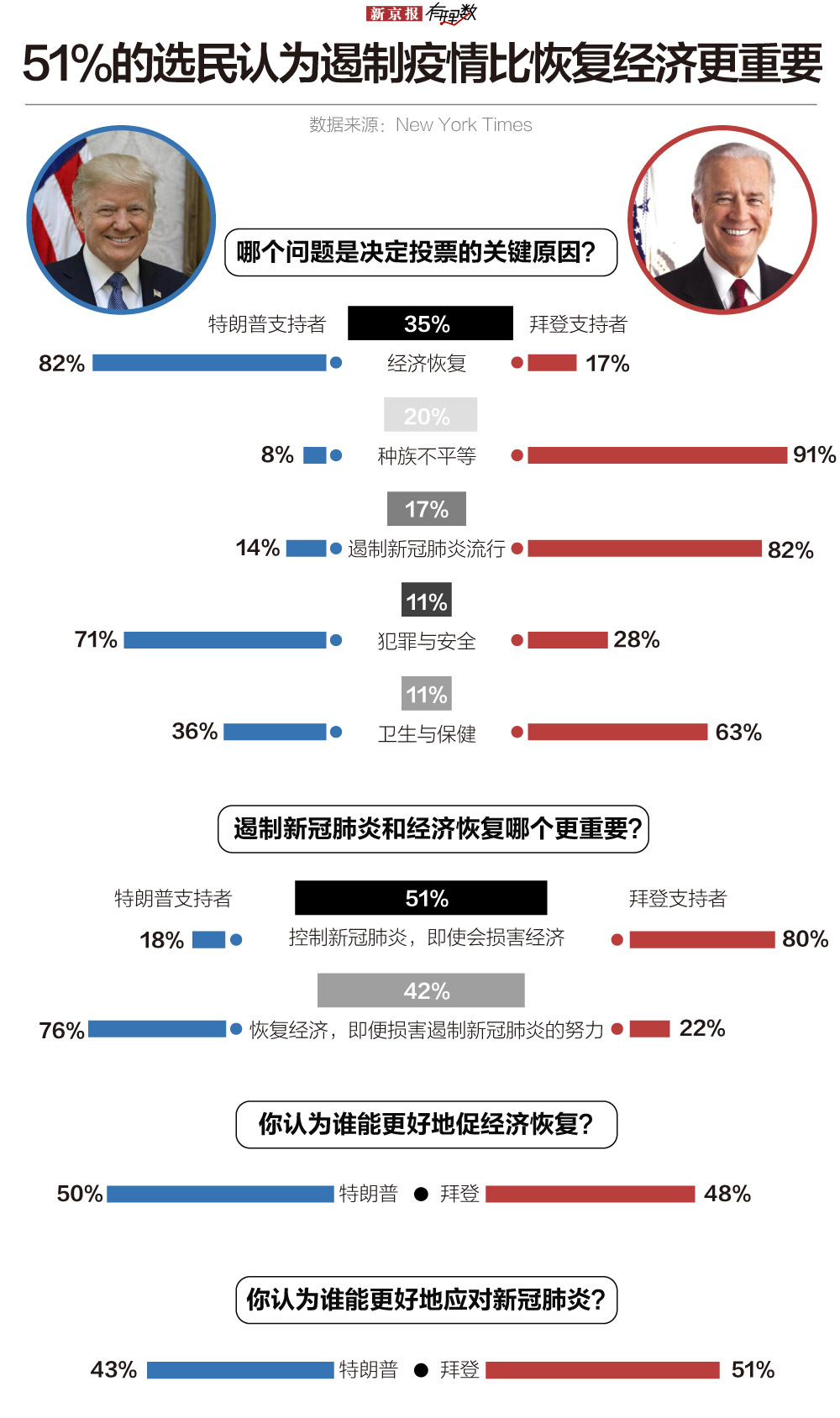 《纽约时报》民调数据显示,尽管美国新冠肺炎疫情仍在继续蔓延,但42%的选民认为恢复经济比抗击疫情更重要,大约35%的选民是冲着经济目标投票的。