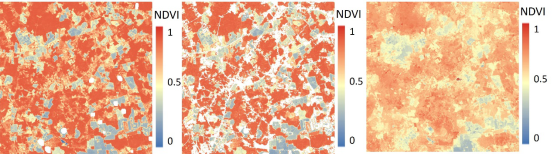 融合效果对比图(左图为原始Landsat 图像,中图为新算法CRC图像,右图为经典融合算法STARFM图像。)中国农科院供图