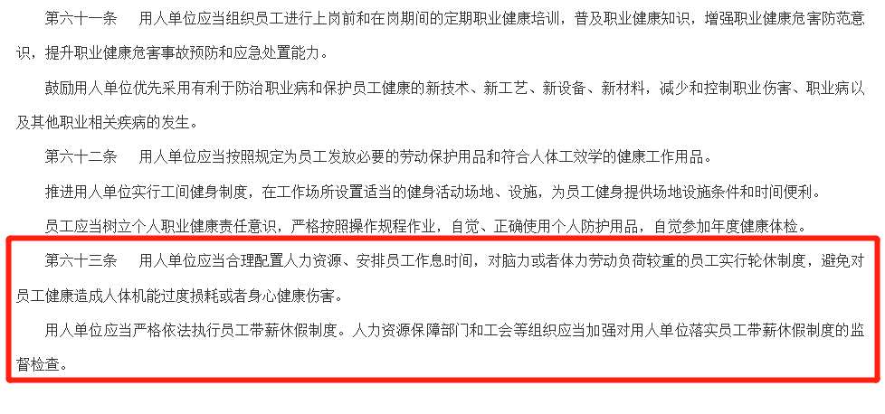 该条例明确提出,用人单位应当合理配置人力资源、安排员工作息时间,对脑力或者体力劳动负荷较重的员工实行轮休制度,避免对员工健康造成人体机能过度损耗或者身心健康伤害。