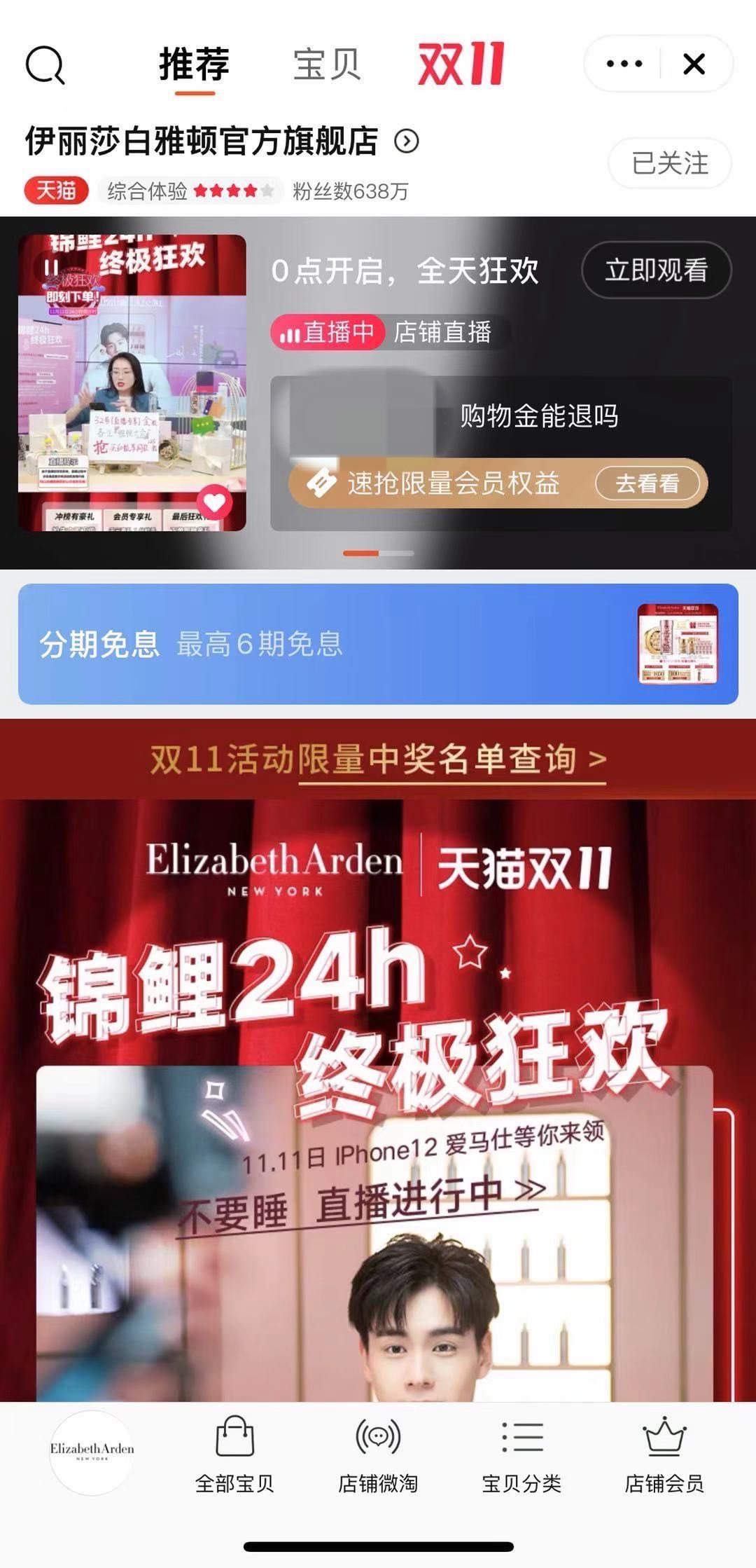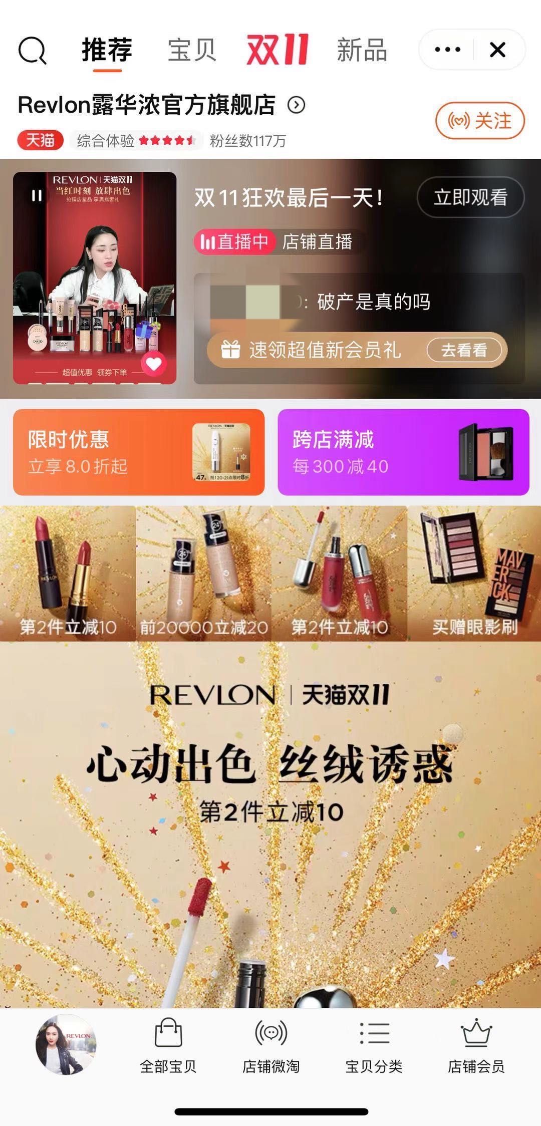 11月11日晚间,新京报记者登录露华浓天猫旗舰店发现,该店铺仍在正常运营。露华浓天猫旗舰店为“双十一”准备的直播也在正常进行中,店铺内商品可正常下单购买。此外,露华浓旗下的伊丽莎白雅顿官方旗舰店也处于正常销售中。