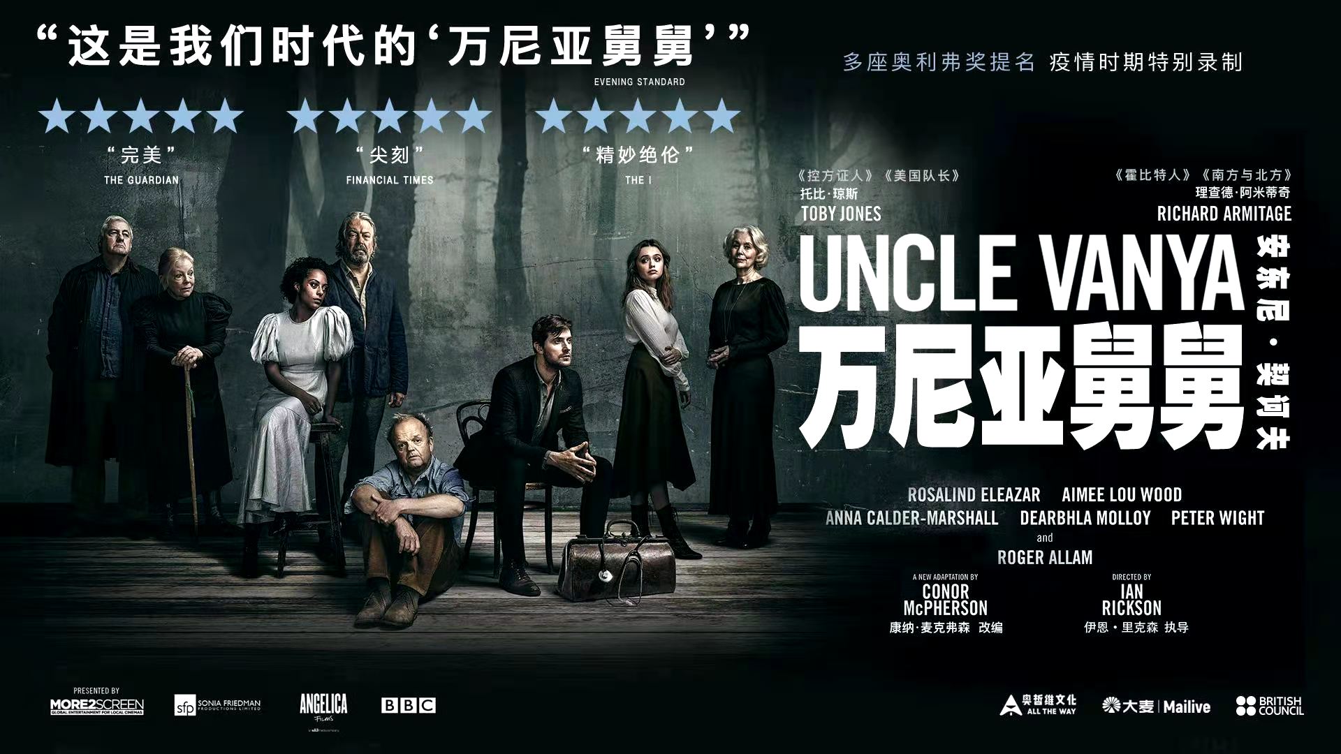 本次发布的新片中,最值得关注的是疫情期间全球唯一一部采用高清影像录制标准拍摄并进行线下发行的作品,由理查德·阿米蒂奇(Richard Armitage)与托比·琼斯(Toby Jones)联袂出演的最新复排版《万尼亚舅舅》。2020年初这版《万尼亚舅舅》才在伦敦西区开演,很快因为疫情中断演出,剧组则重回剧场专门录制了高清影像作品。