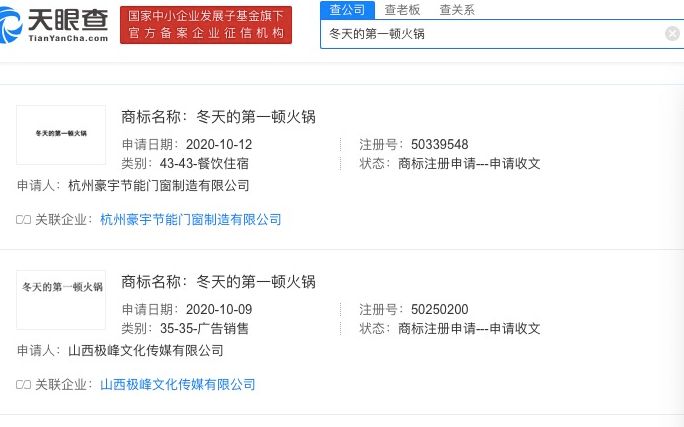 天眼查App显示,近日,“冬天的第一顿火锅”也被申请注册成商标。申请人包括杭州豪宇节能门窗制造有限公司、山西极峰文化传媒有限公司、重庆扬数林文化传播有限公司、义乌市御尧电子商务有限公司等。国际分类包括餐饮住宿、广告销售,以上申请商标状态绝大多数还处于等待实质审查。