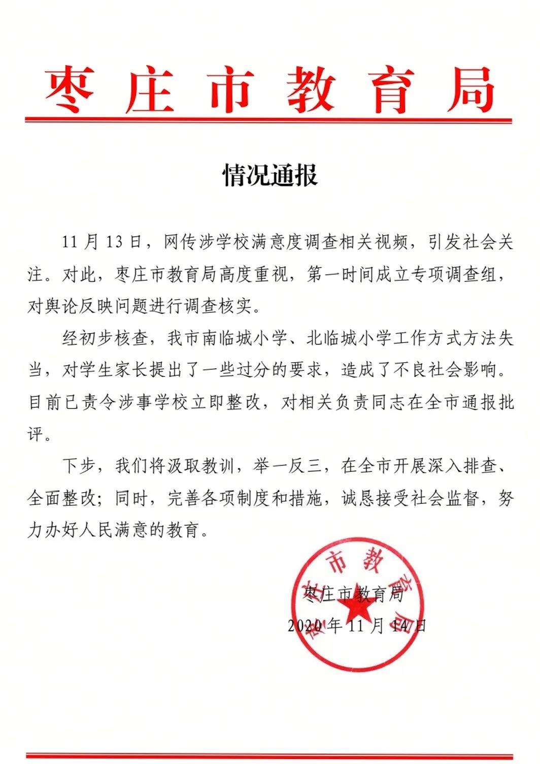 通报表示,11月13日,网传涉学校满意度调查相关视频,引发社会关注。对此,枣庄市教育局高度重视,第一时间成立专项调查组, 对舆论反映问题进行调查核实。