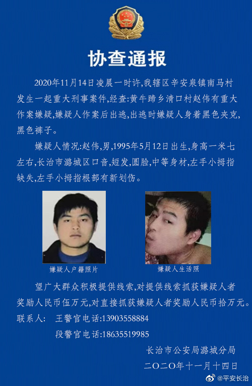 新京报讯(记者 马新斌 张静姝)11月14日下午,新京报记者从山西长治警方获悉,14日凌晨,潞城区南马村发生一起重大刑事案件,嫌疑人赵伟作案后出逃,警方悬赏5万至10万元缉捕。