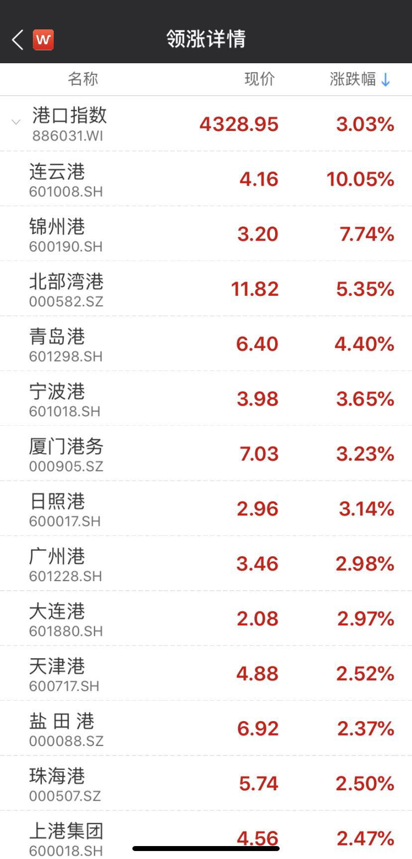 Wind数据统计,申万二级行业指数中,港口||早盘大涨3.03%,连云港、锦州港、北部湾港、青岛港、宁波港、厦门港务等19只概念股全部飘红,其中,连云港(601008)、锦州港(600190)、北部湾港(000582)涨幅在5%以上,连云港(601008)涨停。