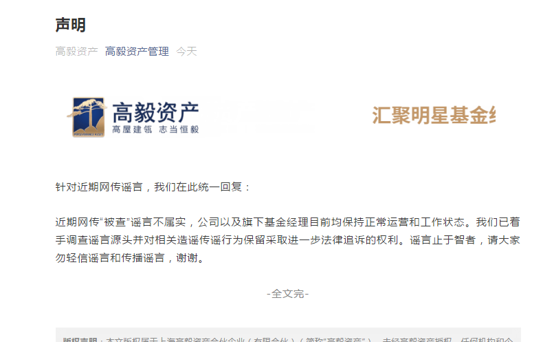 网传被查, 高毅资产回击:谣言不属实,已着手调查源头