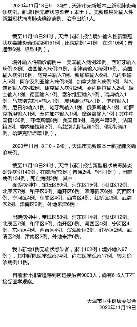 新京报快讯 据天津市卫生健康委员会官方微博消息,2020年11月18日0-24时天津市新型冠状病毒肺炎疫情情况公布。