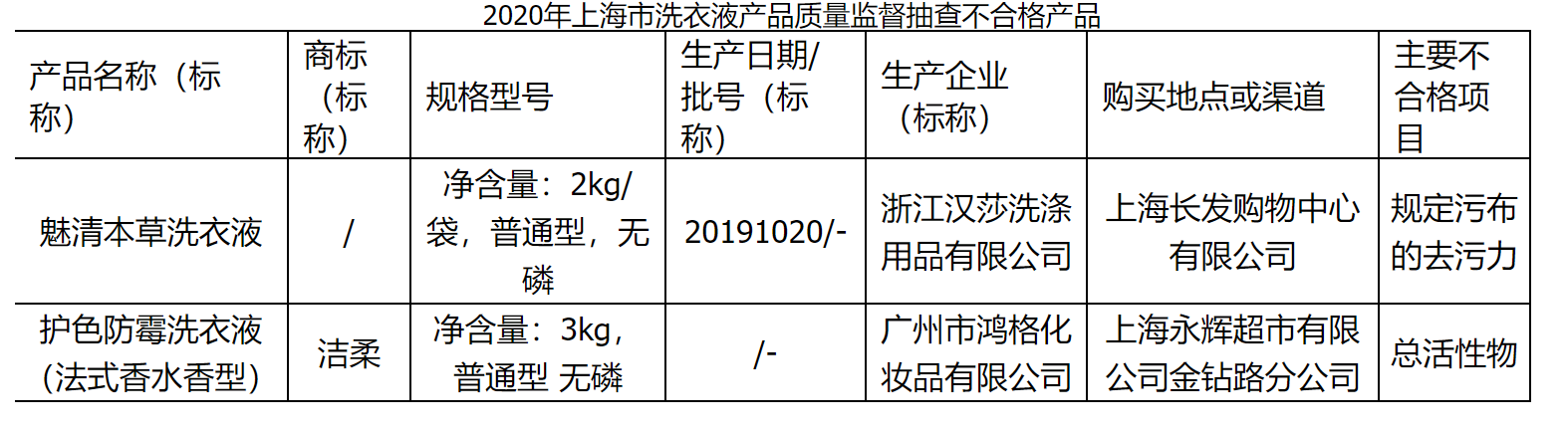 抽查结果显示,有2批次产品不符合标准要求,涉及不合格项目为总活性物、规定污布的去污力。其中,1批次由浙江汉莎洗涤用品有限公司生产的魅清本草洗衣液(净含量2kg/袋,普通型,无磷;20191020)不合格,购买地点或渠道为上海长发购物中心有限公司;另有1批次由广州市鸿格化妆品有限公司生产的“洁柔”牌护色防霉洗衣液(法式香水香型)(净含量3kg,普通型 无磷)不合格,购买地点或渠道为上海永辉超市有限公司金钻路分公司。