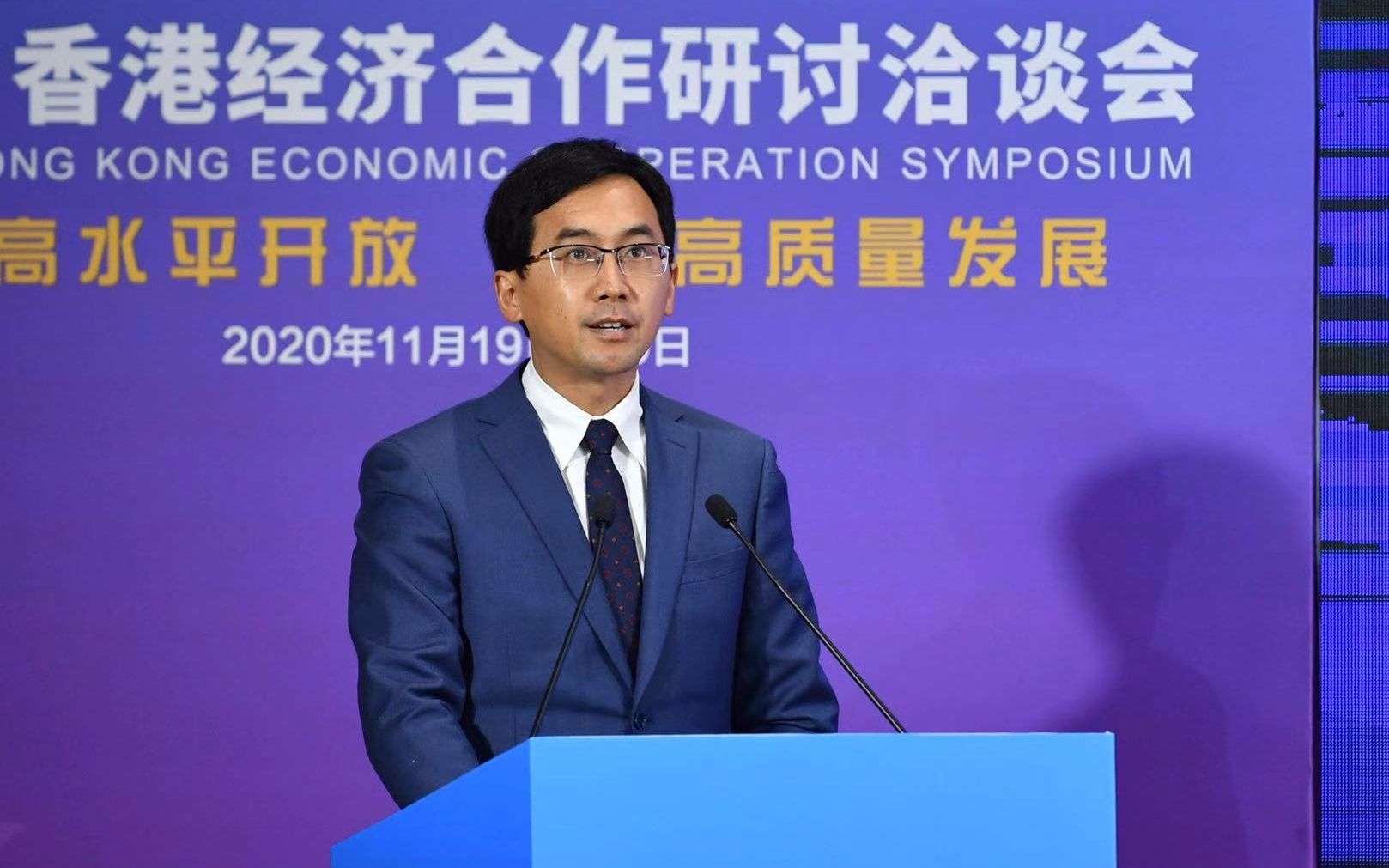 11月19日,石景山区政府副区长周西松在第二十三届京港洽谈会投资北京推介会上发言。摄影/新京报记者 吴江