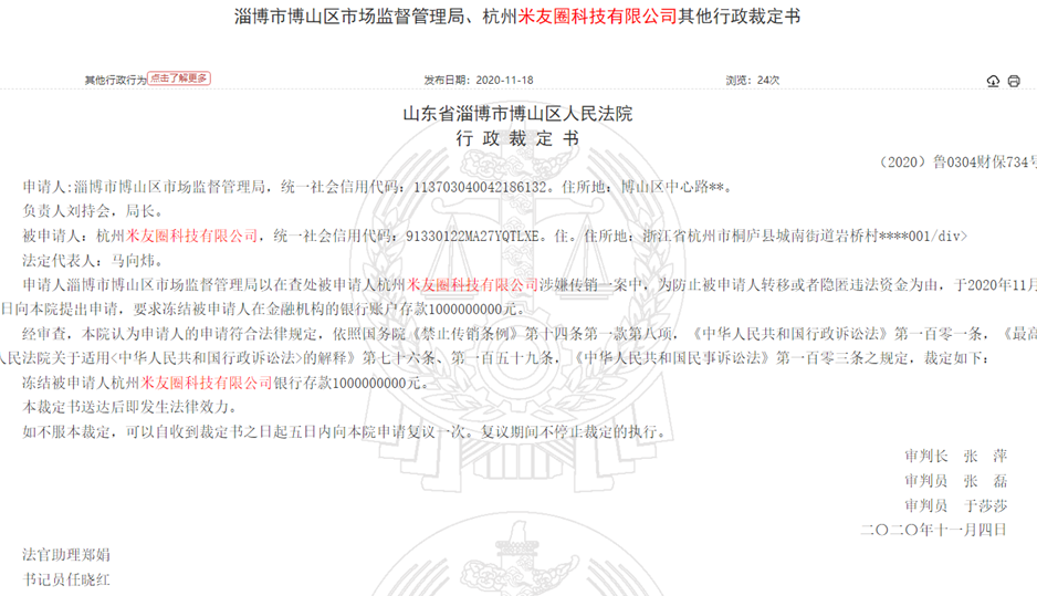 中国裁判文书网11月18日发布的信息显示,杭州米友圈科技有限公司因涉嫌传销,被淄博市博山区市场监管局查处。为防止该公司转移或者隐匿违法资金,博山区市场监管局于11月4日向山东省淄博市淄博区人民法院提出申请,要求冻结被申请人银行账户存款10亿元。这一申请得到法院支持。不过,目前在中国裁判文书网已不能搜索到该判决书信息。