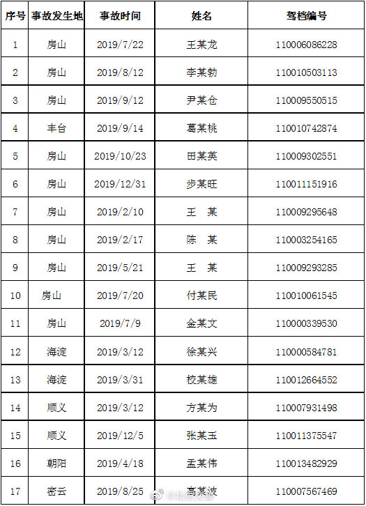 新京报快讯 据北京市公安局公安交通管理局官方微博消息,近日,北京交管部门对发生交通事故且逃逸、构成犯罪的本市17名驾驶员,依法作出吊销机动车驾驶证,且终生不得重新取得机动车驾驶证的处罚。