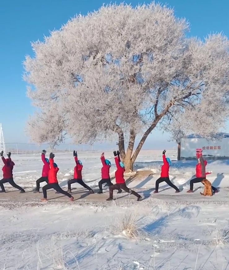 雪白的大地和村民身上红色的棉服形成鲜明的对比。只见村民们前后并排站起,从拉伸、伸张等热身活动做起,逐渐开始进入瑜伽动作,有的村民甚至直接在雪地里做起了“一字马”。
