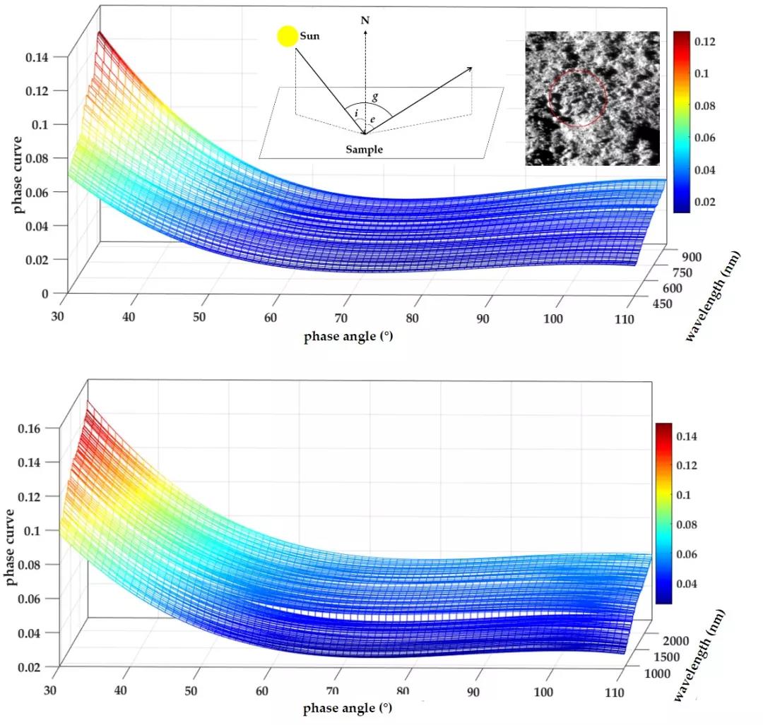 山东大学行星科学团队联合中科院上海技物所、地化所和空间中心的研究团队,利用嫦娥四号红外成像光谱仪就位探测光谱数据,结合实验室光度实验数据,获得了红外光谱仪可见近红外波段(450-2395nm)范围内的Lommel-Seeliger模型相函数,建立了一套月球表面辐亮度随入射角、出射角和太阳相角变化的光度模型。