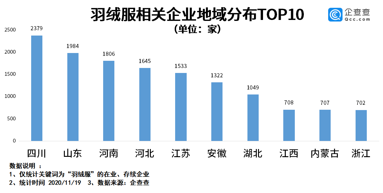 从企业地域分布来看,企查查数据显示,我国羽绒服相关的企业大多分布在四川、山东、河南、河北、江苏等地。其中四川省企业量位居全国第一,目前2300多家企业。山东省排名第二,共有1984家企业。河南省排名第三,有1806家企业。目前企业数量较多的地区还有安徽、湖北、江西等地。