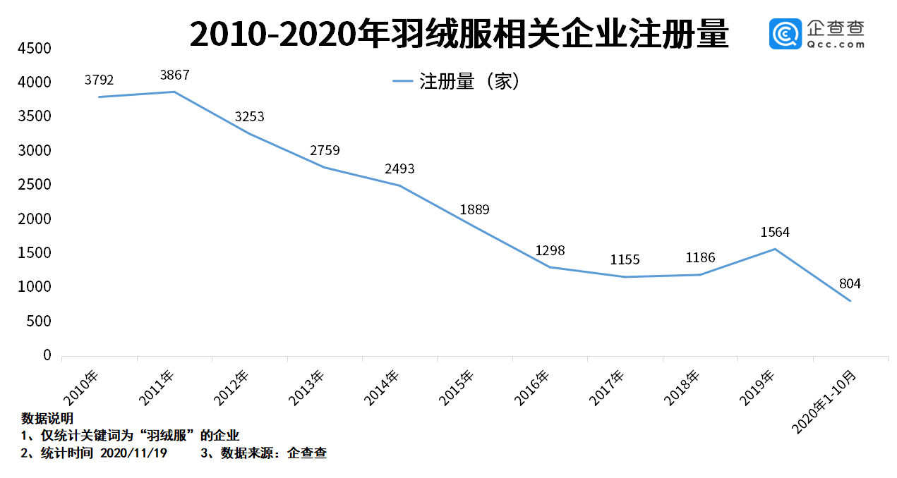 过去十年,羽绒服曾经一度和“时尚”两个字脱钩,难以得到年轻人群的青睐,因此相关企业的年注册量也呈下跌趋势。企查查数据显示,年注册量从2011年的3867家逐渐下降至2107年的1155家。随着近两年羽绒服再度进入流行趋势,相关企业注册量实现了上升,2019年新增企业1564家,同比增长31.9%。今年1至10月,共注册了804家企业,同比降低了39.2%。
