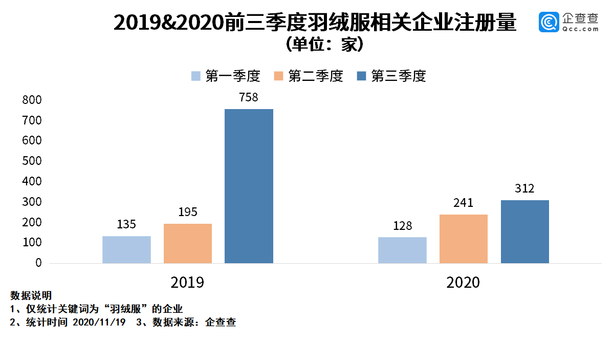 企查查数据显示,今年前三个季度,我国羽绒服相关的企业共新注册了681家,同比下跌了37.4%。其中第三季度注册量最多,为312家,环比增长了29.5%。