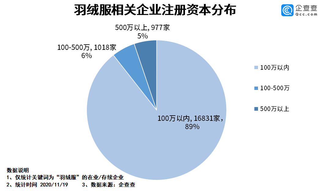 从企业注册资本分布来看,企查查数据显示,注册资本在100万以内的羽绒服企业数量最多,约1.7万家,占比企业总量的89%。注册资本在500万以上的羽绒服企业数量最少,有977家,占比企业总量的5%。