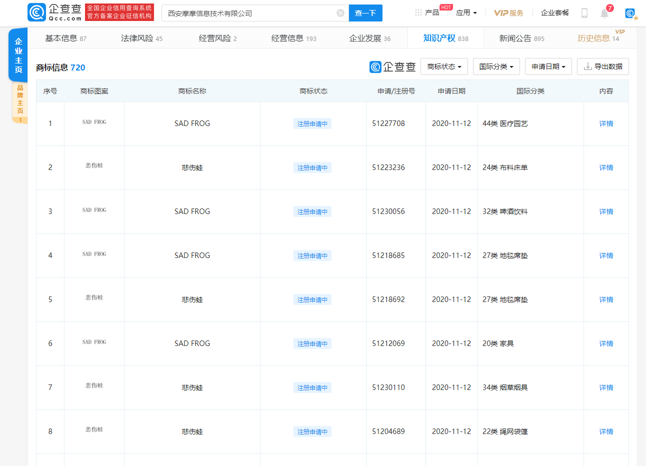 企查查App显示,近日,暴走漫画隶属企业西安摩摩信息技术有限公司新增多条商标信息,商标名称为“悲伤蛙”、“SAD FROG”,国际分类包含家具、食品、餐饮住宿等,目前部分商标状态为商标申请中、等待实质审查。企查查显示,西安摩摩信息技术有限公司成立于2010年9月,法定代表人为暴走漫画CEO任剑,注册资本5000万元,经营范围含互联网信息服务;互联网新闻信息服务;演出经纪等。企查查App股权穿透数据显示,该公司由上海暴走信息科技有限公司全资控股,优酷信息技术(北京)有限公司、创新工场维申(上海)创业投资中心(有限合伙)等间接持股。