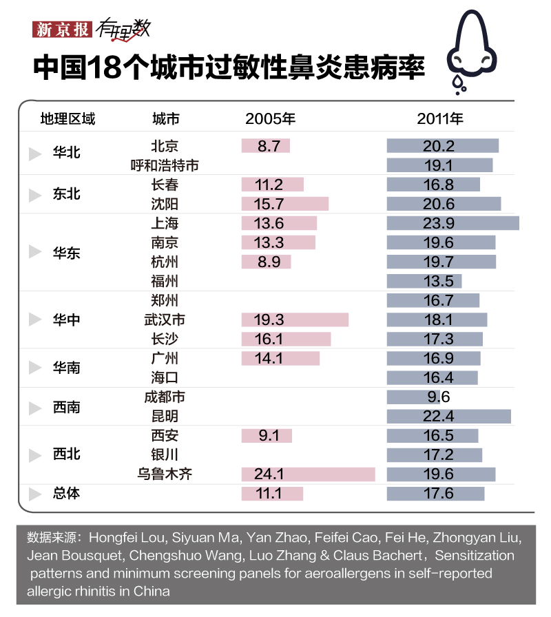 从城市分布来看,上海、昆明、沈阳、北京的过敏性鼻炎最严重。除此之外,杭州、南京、乌鲁木齐、呼和浩特和武汉的患病率也高,都要高于平均17.6%的患病率。