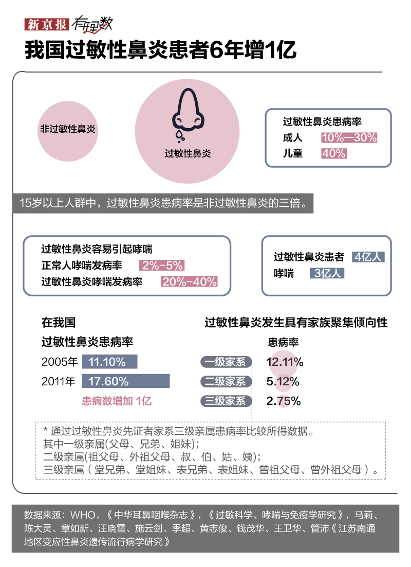 在中国,过敏性鼻炎患者也越来越多。2005年时,中国居民的过敏性鼻炎患病率在8.7%—24.1%之间,总体的患病率为11.1%。到了2011年,过敏性鼻炎的总体患病率已经上升到了17.6%,患病人数增加了1亿。