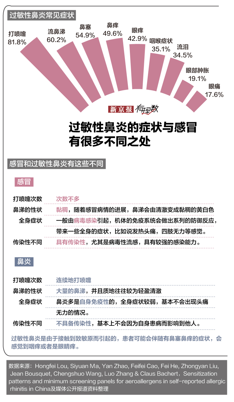 除此之外,流鼻涕、鼻塞、鼻痒也比较常见,甚至还会“殃及池鱼”,出现眼痒、咽喉不适、流泪、眼肿等症状。