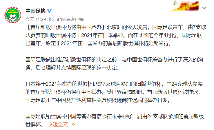 中国足协通过社交媒体表示,北京时间今天凌晨,国际足联宣布,由7支球队参赛的旧版世俱杯将于2021年在日本举办。而在此前的今年4月份,国际足联已宣布,原定于2021年在中国举办的首届新版世俱杯将延期举行。