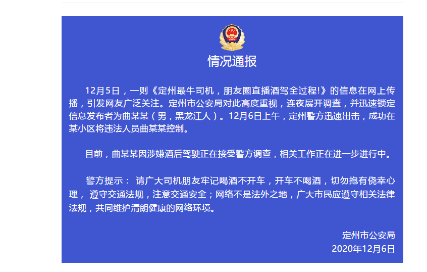 新京报快讯 据定州发布微信公众号消息,12月5日,一则《定州最牛司机,朋友圈直播酒驾全过程!》的信息引发关注。12月6日,定州公安发布通报,经查,信息发布者为曲某某(男,黑龙江人)。12月6日上午,警方在某小区将违法人员曲某某控制。