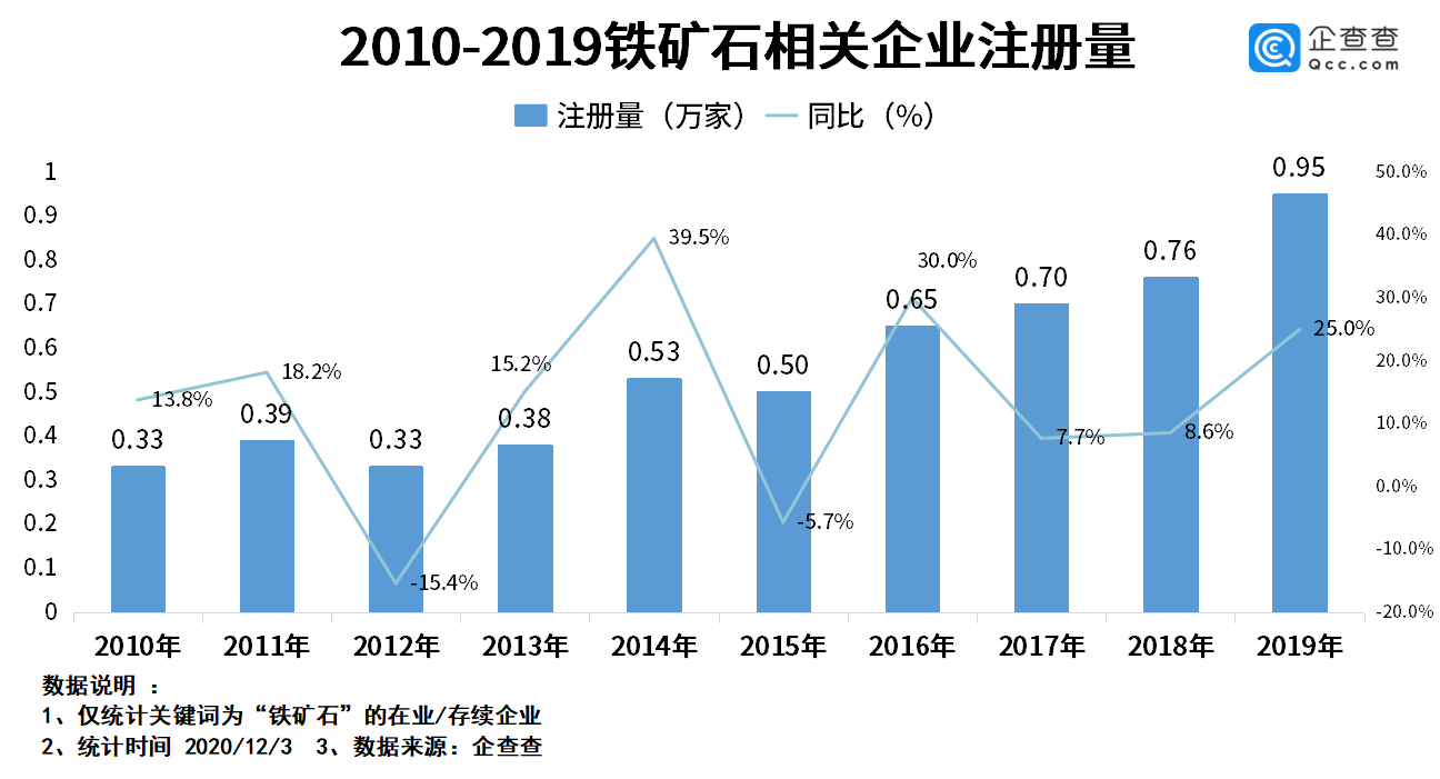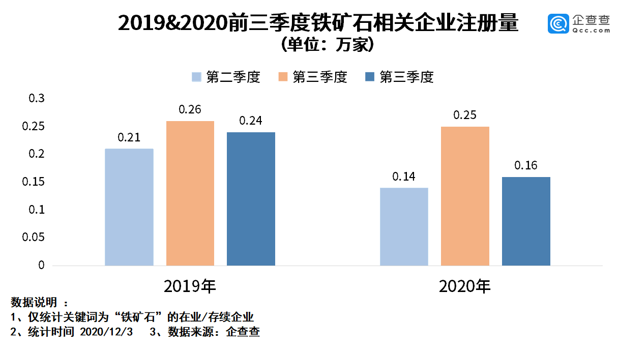 企查查数据显示,2020年前三季度,铁矿石相关的企业一共新注册了0.55万家,同比增长14.3%。其中,第一季度注册量是0.14万家,第二季度0.25万家,第三季度0.16万家。
