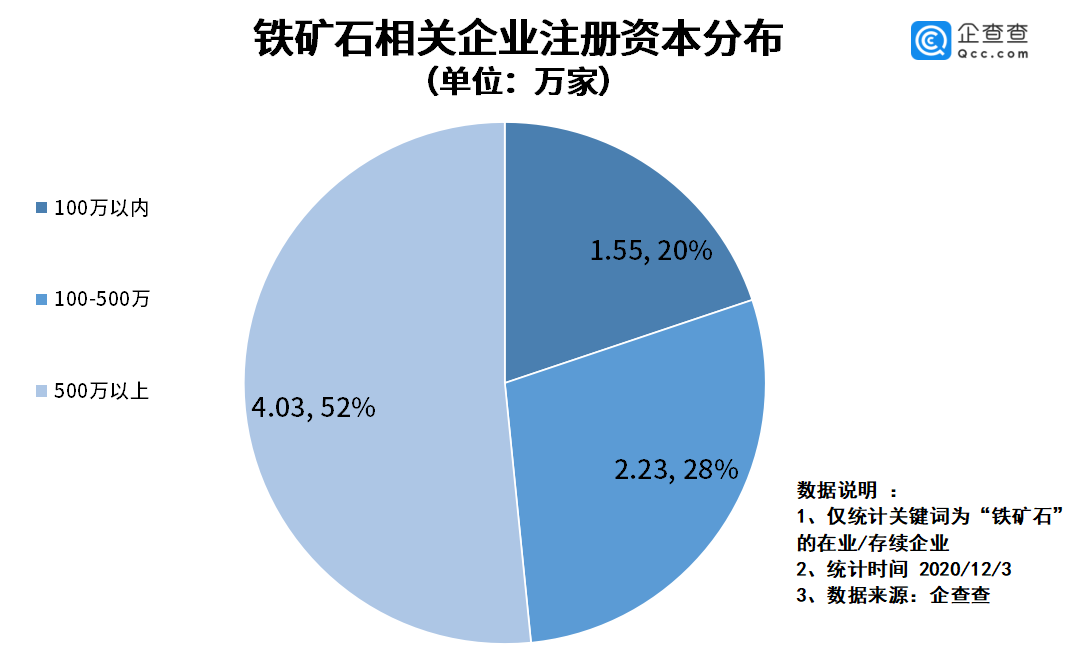 铁矿石被称作“钢铁的粮食”,其价格大幅上涨也会带来钢企成本普遍上涨的隐忧。企查查数据显示,截至2020年12月,我国范围内与“铁矿石”相关的在业、存续企业一共有7.8万家。